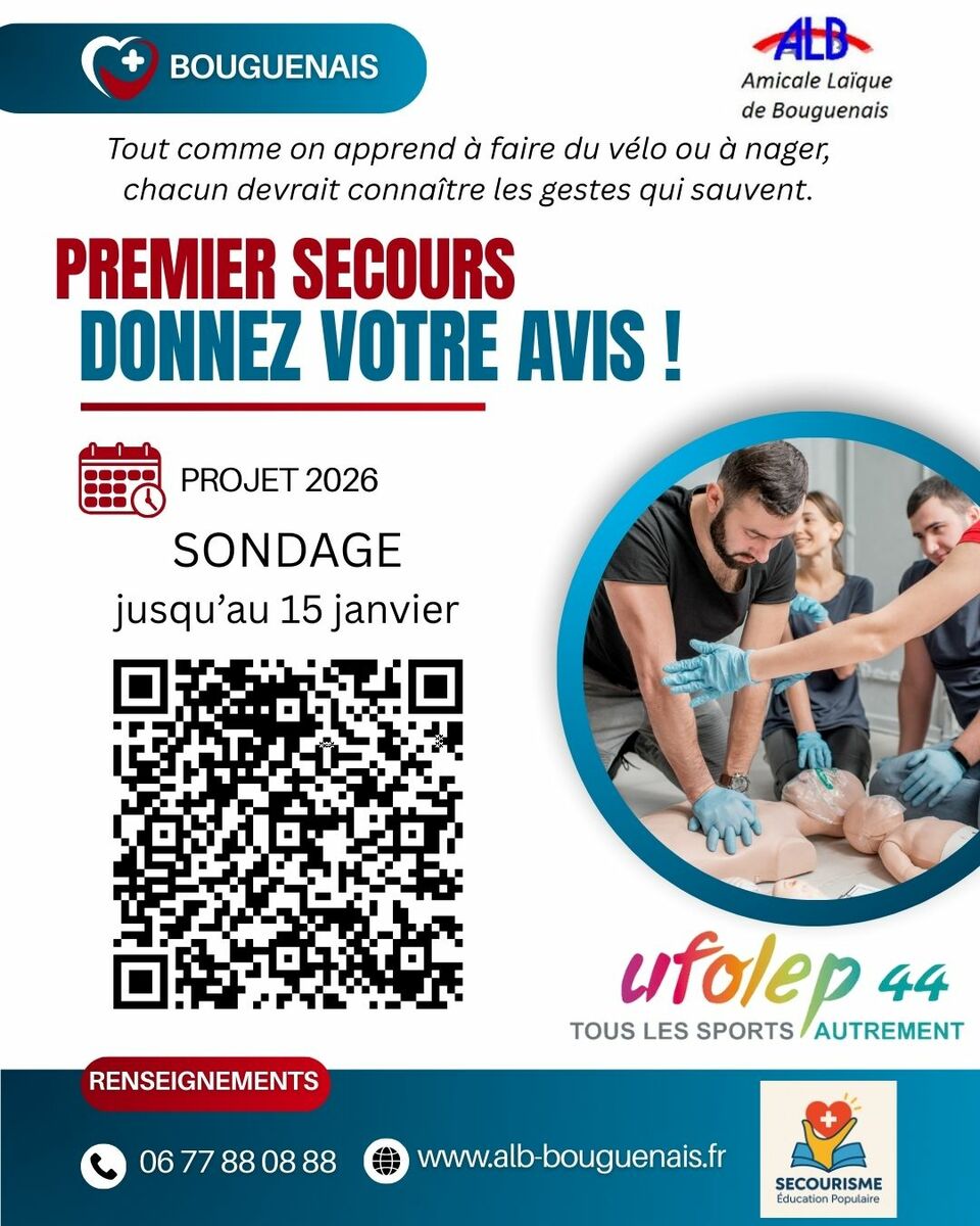 Ce sondage a pour but de recueillir vos attentes dans le domaine du secourisme, nous avons le projet de lancer, pour l'année prochaine, des ateliers accessibles à tous (enfants, parents, bénévoles…) et le PSC (Formations Premiers Secours Citoyen) réalisable en collaboration avec l'UFOLEP 44 . Aidez – nous a recueillir les informations sur vos attentes afin de proposer des ateliers adaptés. Flashez le QR Code ou cliquez sur le lien
